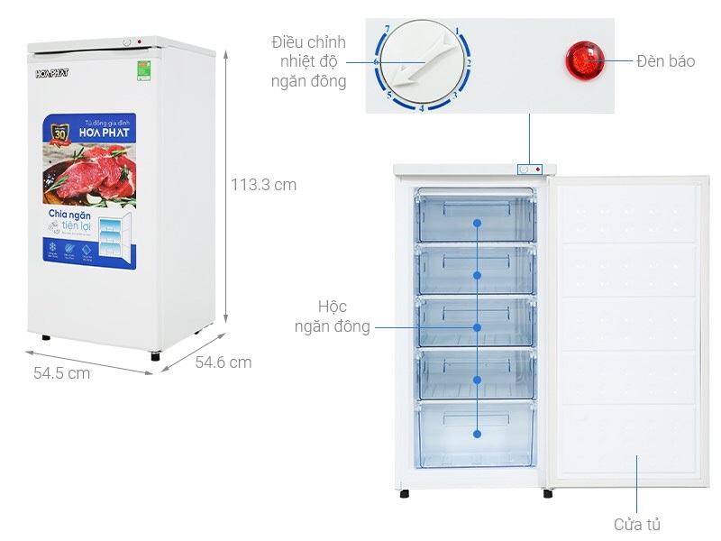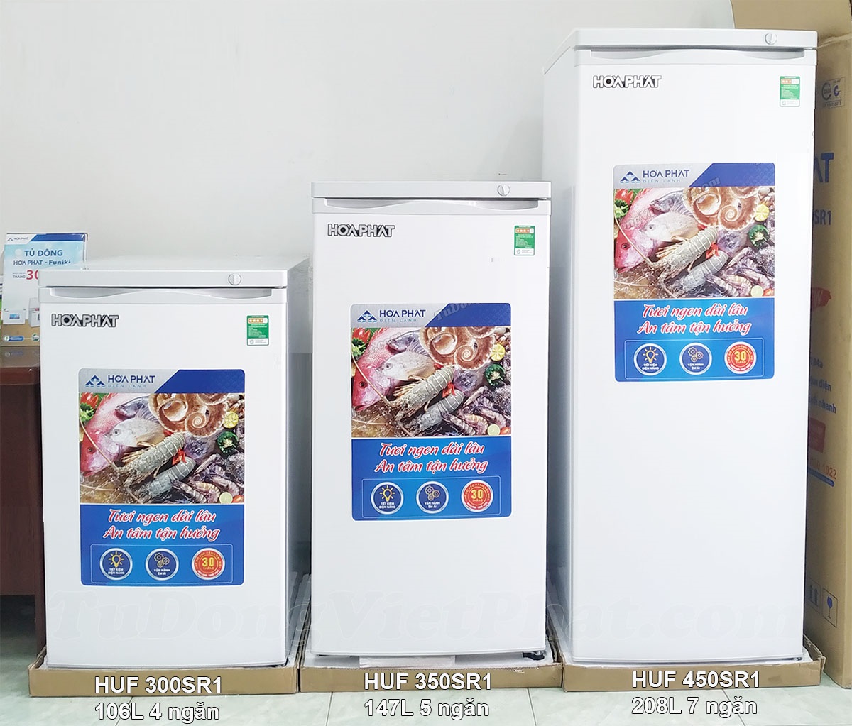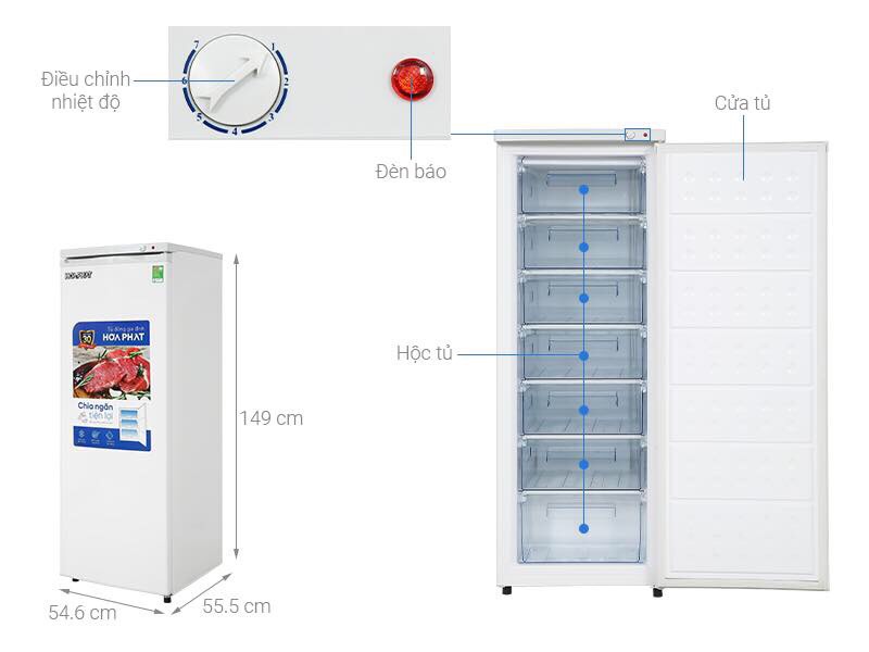Tủ đông đứng Hòa Phát thiết kế cửa mở phía trước như tủ lạnh. Bên trong tủ được chia thành nhiều ngăn đông. Các kích thước 106 lít 4 ngăn, 147 lít 5 ngăn, 152 lít 6 ngăn, 208 lít 7 ngăn, 220L 8 ngăn và 280 lít 6 ngăn lớn. Độ lạnh sâu dưới âm 18 độ C (<-30oC) giúp tủ bảo quản thực phẩm tươi ngon. Máy nén êm. Tiết kiệm điện. Mẫu tủ đông đứng Hòa Phát 4 ngăn là sản phẩm dẫn đầu thị trường tủ đông trữ sữa mẹ. Sản phẩm được Tập đoàn Hòa Phát sản xuất tại KCN Phố Nối A, Hưng Yên. Công ty chúng tôi phân phối số 1 tủ đông đứng Hòa Phát
