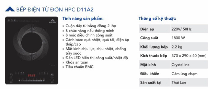 | BẾP TỪ ĐƠN HÒA PHÁT » Điện áp 220 V~240 V, 50 Hz/60Hz » Công suất 1800 W » Cuộn dây từ bằng đồng 2 lớp » Điều khiển cảm ứng » 8 chức năng nấu thông minh » 8 mức điều chỉnh công suất » Cảnh báo: quá nhiệt, quá tải, điện áp thấp/cao » Mặt kính chịu lực, chịu nhiệt, chống trầy xước » Đèn LED hiển thị công suất/nhiệt độ » Khóa an toàn » Tiêu chuẩn EMC » Khối lượng sản phẩm: 2.2 kg » Kích thước sản phẩm (RxCxS): 370 x 290 x 40 (mm) » Sản xuất tại: Thái Lan |