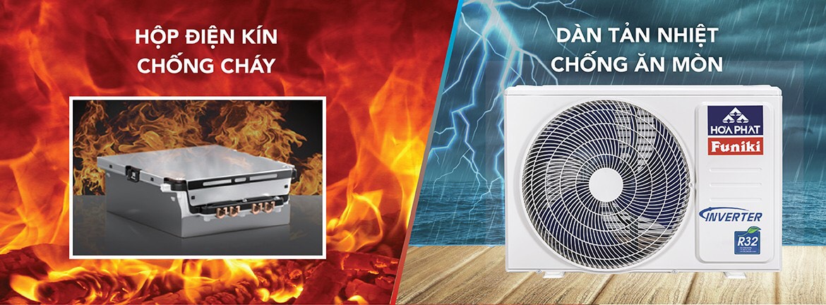 Điều hòa treo tường Funiki Inverter 18000btu 1 Chiều HIC 18MMC sử dụng các ống đồng ở dàn nóng, có độ bền cao hơn các vật liệu thông thường khác. Các lá tản nhiệt ở dàn lạnh và dàn nóng được mạ lớp bảo vệ có hiệu năng chống gỉ và ăn mòn cao hơn lớp mà thông thường, làm tăng tuổi thọ, ngăn ngừa vi khuẩn sinh sôi và lây lan một cách hiệu quả. Chịu được các chất ăn mòn đến từ các tác nhân bên ngoài như mưa, hơi muối biển,…vv. Hộp điện được niêm phong bằng tấm kim loại chống cháy và được siết chặt để bảo vệ, phòng ngừa rủi ro về chập điện, cháy, côn trùng, ẩm ướt.