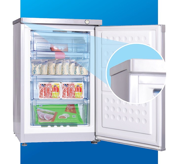 Tủ đông đứng 1 chế độ ( Đông) 110 lít - 4 tầng - dùng Gia đình được trang bị máy nén hiệu suất cao, chế độ làm lạnh trực tiếp sẽ giúp cho tủ hoạt động hiệu quả hơn rất nhiều, thời gian làm lạnh nhanh, độ lạnh sâu, nên có thời gian bảo quản thực phẩm tốt hơn, khả năng kháng khuẩn, chống nấm mốc hiệu quả hơn. Môi chất lạnh R134a đem tới hiệu quả làm lạnh tối ưu, tiết kiệm điện năng. Nút điều chỉnh nhiệt độ bên ngoài rất tiện dung giúp việc điều chỉnh nhiệt độ phù hợp được thuận tiện, dễ dàng.