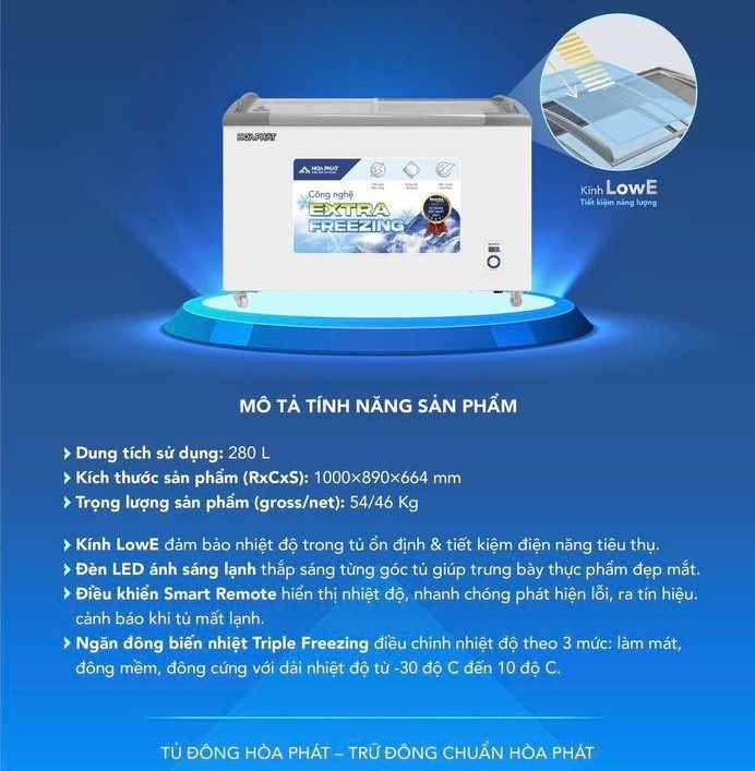 Tủ đông trưng bày Hòa Phát HSF AD6280.C1 sở hữu công nghệ Extra Freezing đông sâu tới -30 độ C, dàn máy nén khoẻ với mặt kính Low E chống thất thoát nhiệt và tính năng hiển thị nhiệt độ, cũng như báo lỗi tự động bên ngoài tủ